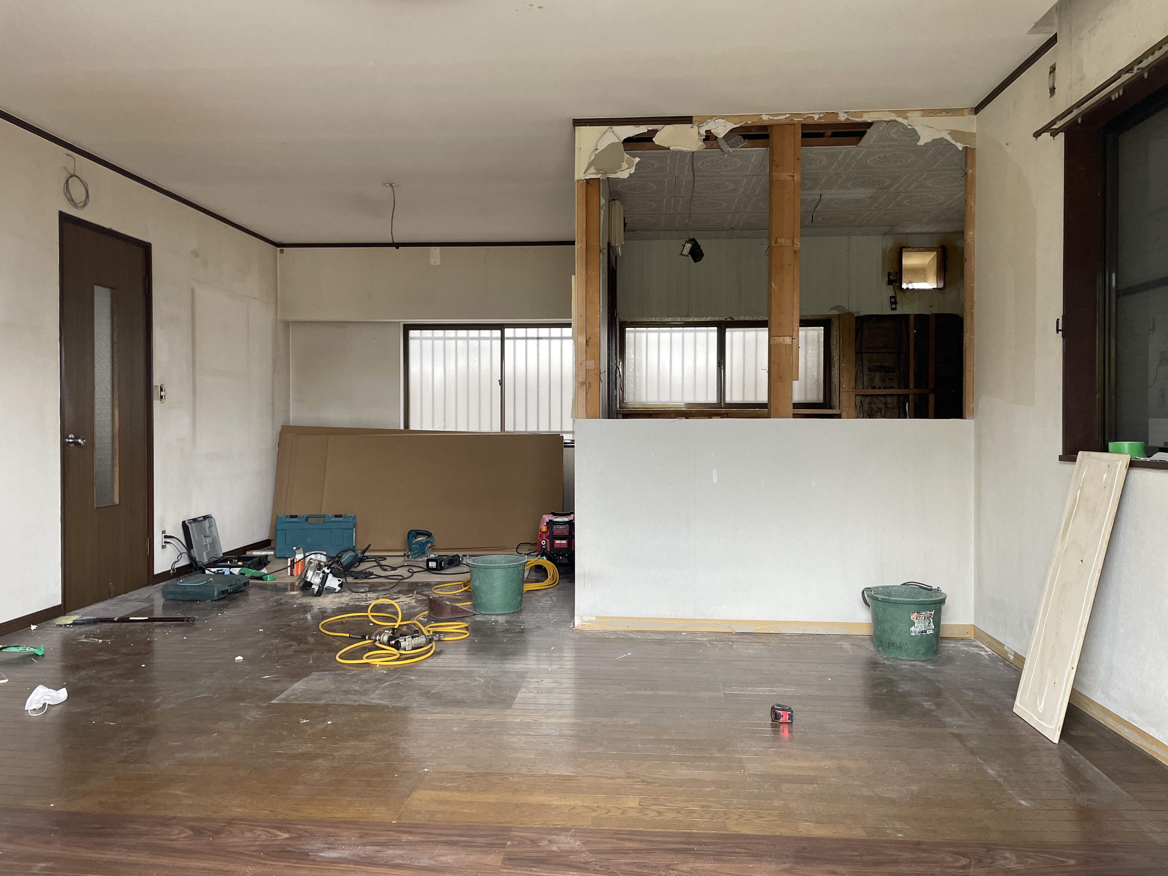 お風呂に続き、キッチンを対面にするために壁解体中
