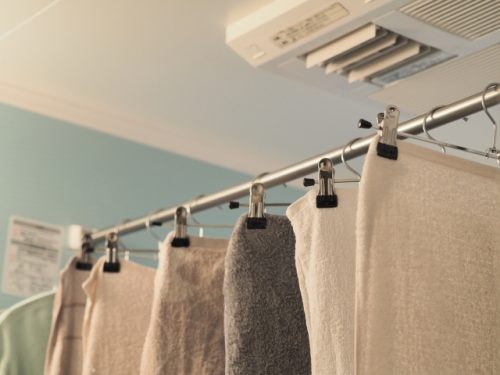 浴室暖房乾燥機も乾きにくい衣類を干す場所として重宝します。お天気が悪いとき、夜間でも干すことができます。子供の体操着や部活のユニフォームなど「明日まで乾かさなきゃ…!」なんていうときも、浴室暖房乾燥機はとても便利なんですよ。