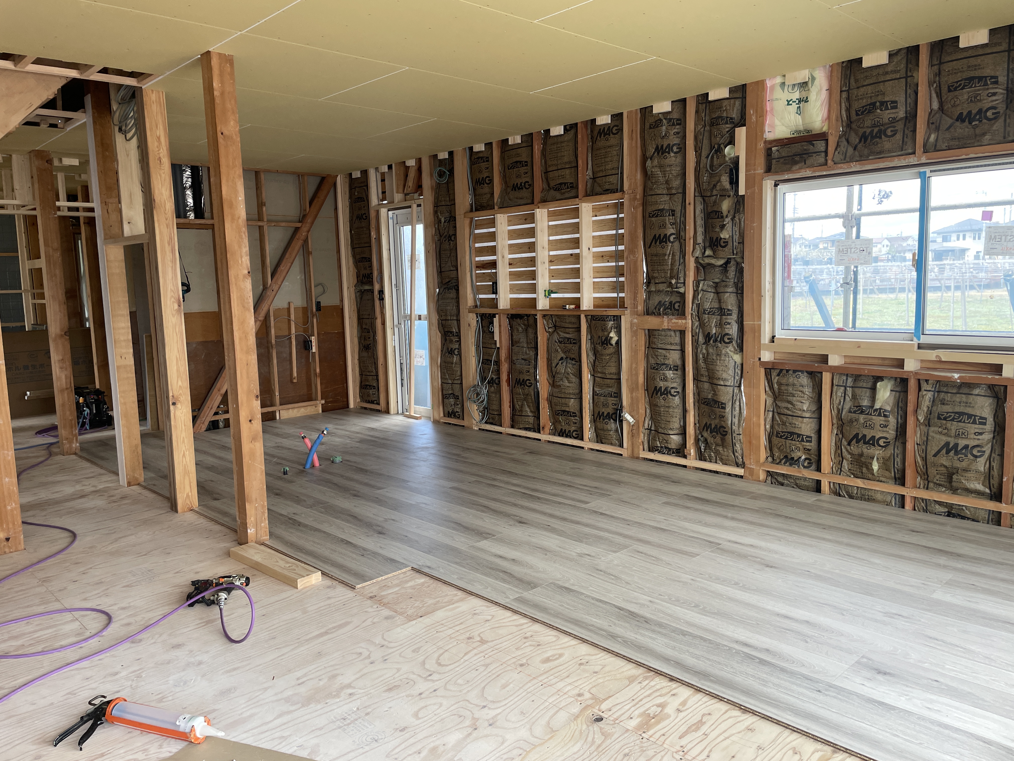 木工事、天井貼終わりフローリング貼に進行してます。
