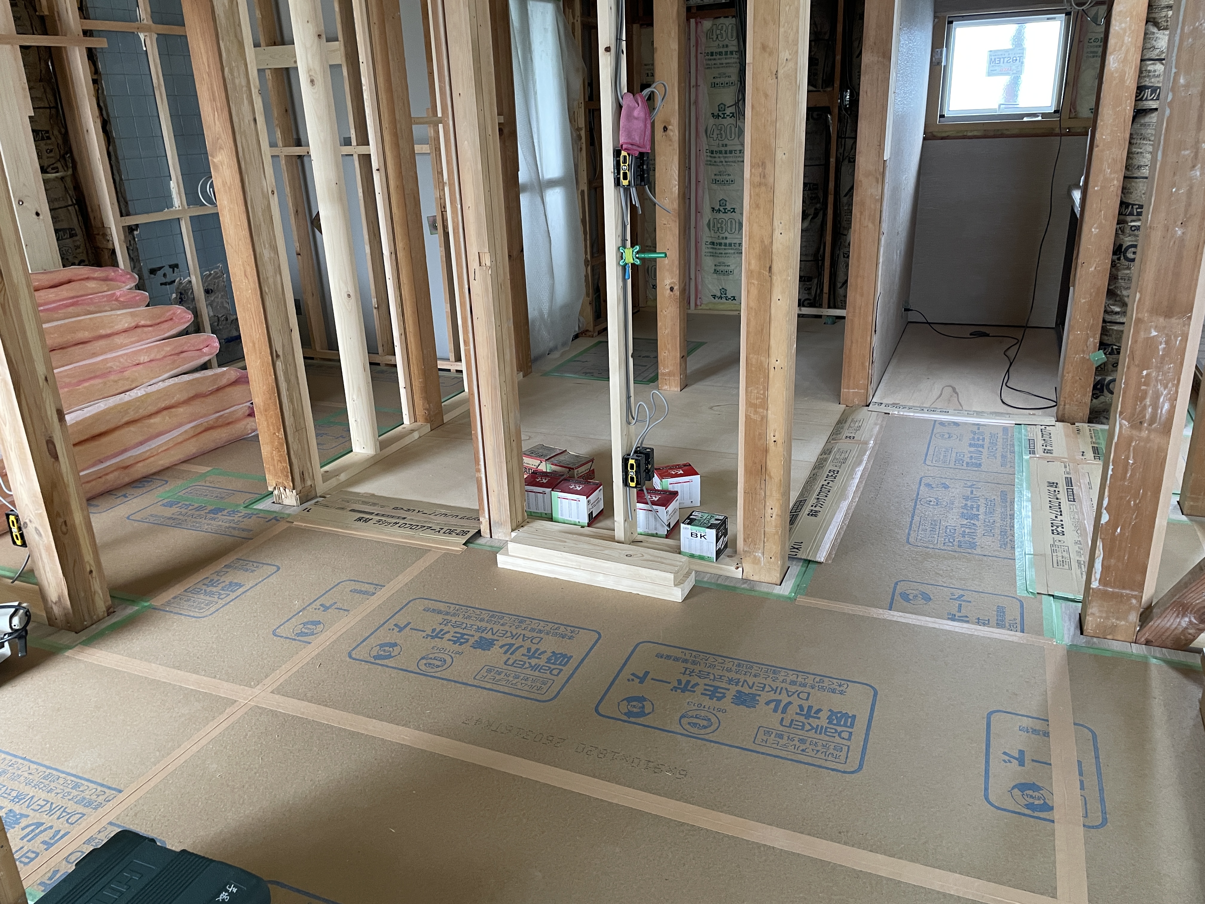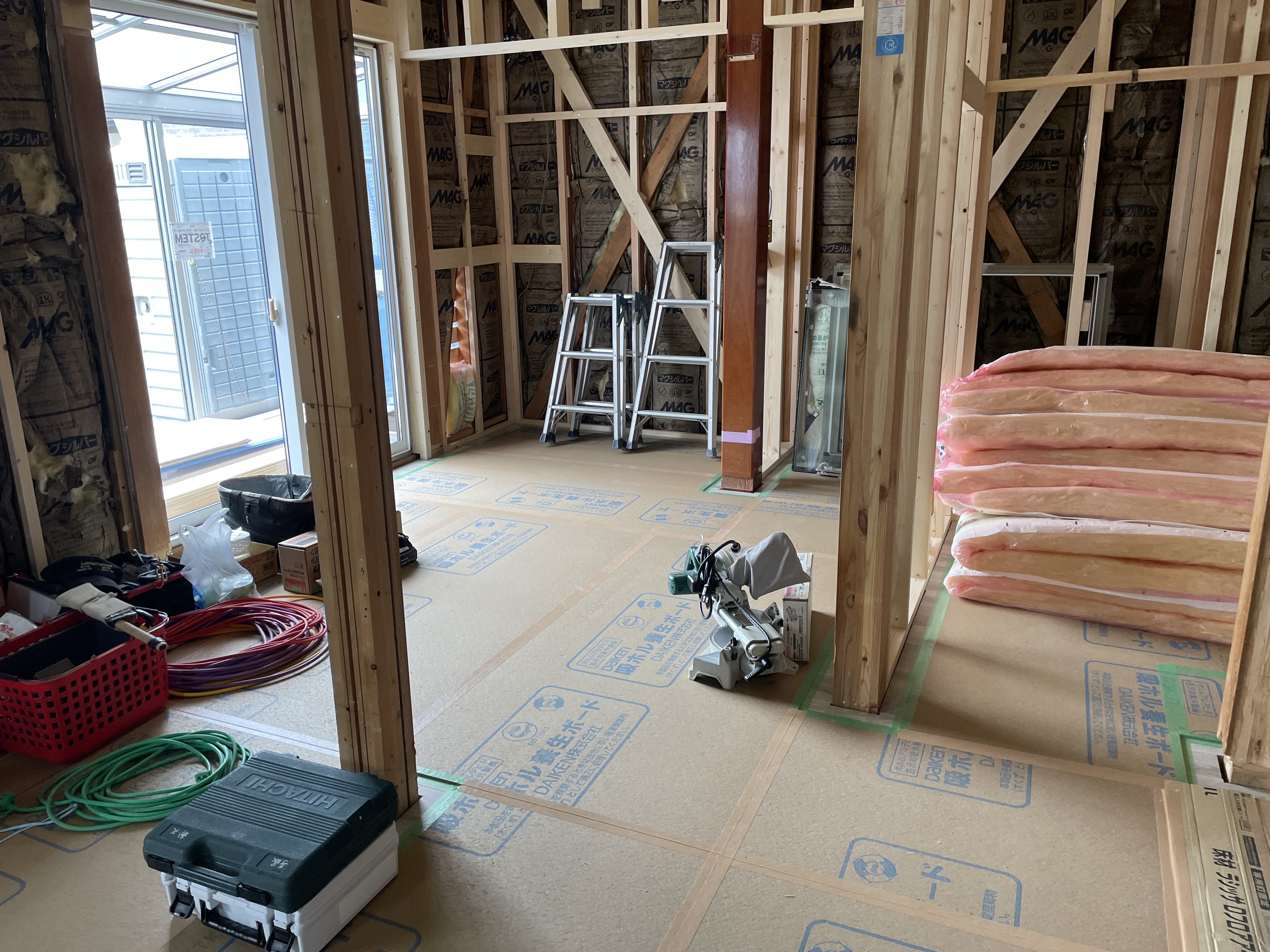 木工事が進んで床フローリングも張り終わり壁に進みます。