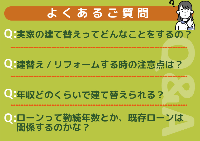 などお困りごとも今回の相談会は建て替え専門の相談会なので安心してご相談ができます。
