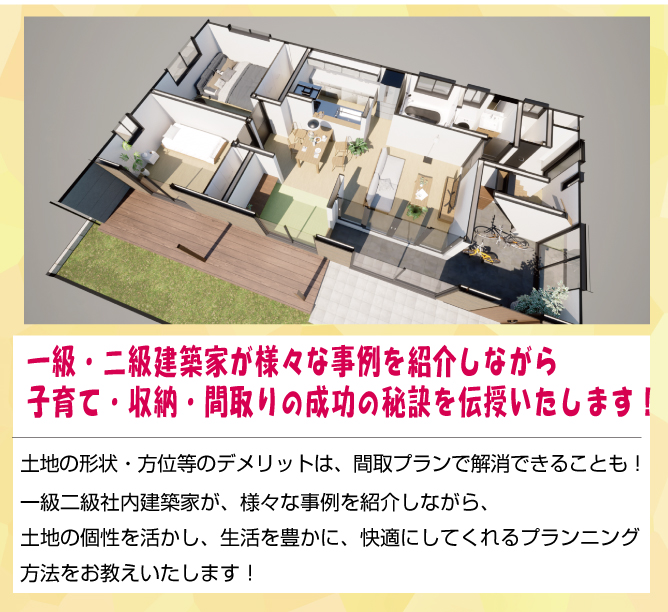 一級二級社内建築家が、様々な事例を紹介しながら、土地の個性を活かし、生活を豊かに、快適にしてくれるプランニング方法をお教えいたします!